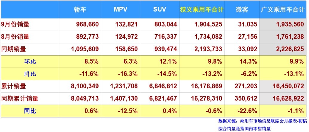 9月份傳統汽車銷售同比下降13.1%